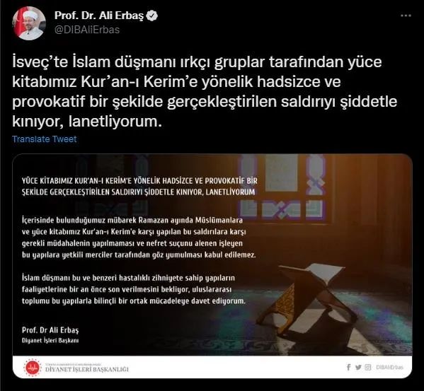 Diyanet İşleri Başkanı Ali Erbaş, İsveç'te Kur'an-ı Kerim'e yönelik saldırıyla ilgili Twitter hesabından açıklama yaptı.