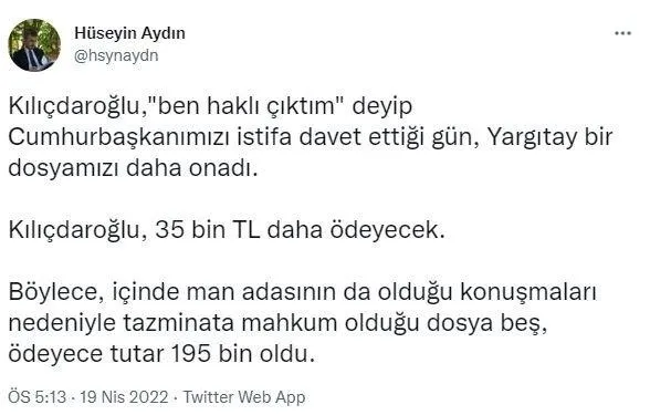 Yargıtay'ın onama kararının ardından Erdoğan'ın avukatı Hüseyin Aydın, sosyal medya hesabından Kılıçdaroğlu'nun 35 bin lira tazminat ödemeye mahkûm edildiğini açıklamıştı. Sabah'ta yer alan habere göre, Aydın, paylaşımında, "Böylece, içinde Man Adası'nın da olduğu konuşmaları nedeniyle tazminata mahkûm olduğu dosya beş, ödeyeceği tutar 195 bin oldu" ifadelerine yer verdi.