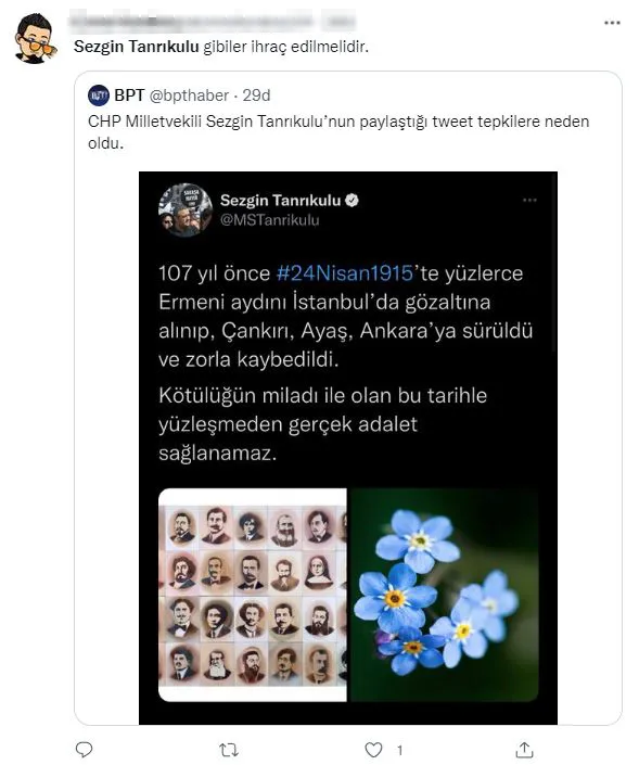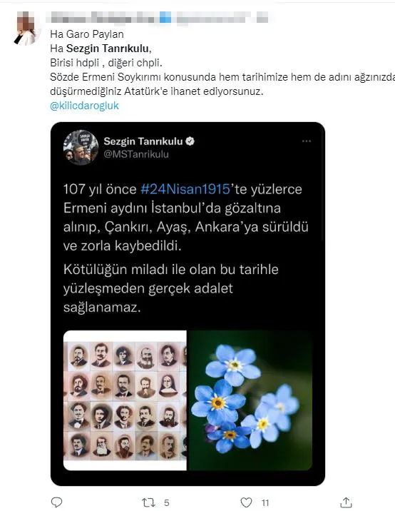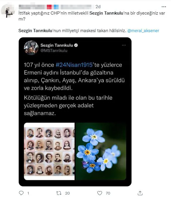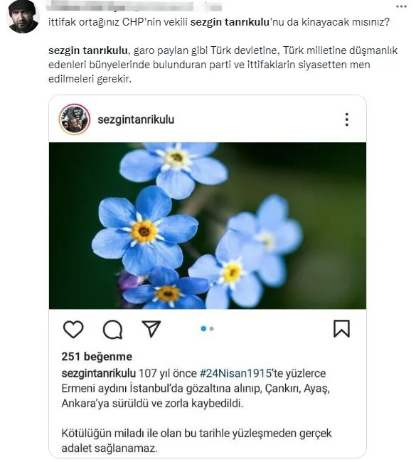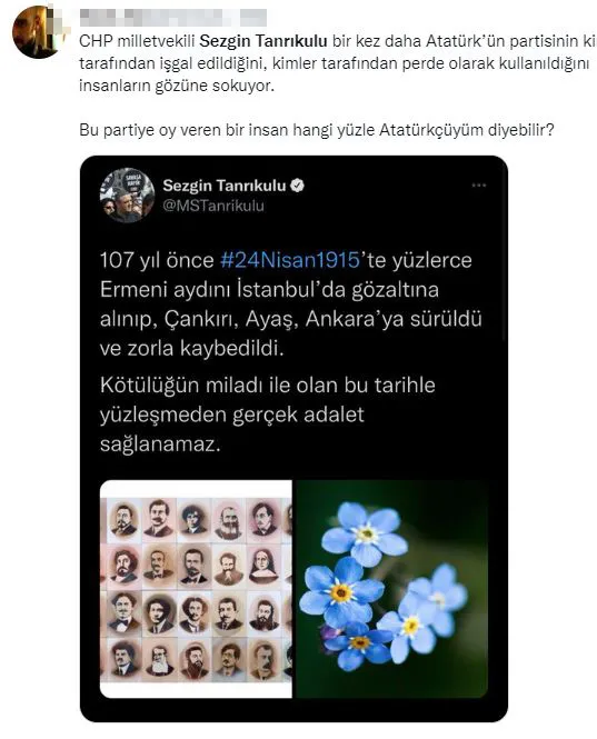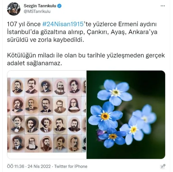 CHP'li Sezgin Tanrıkulu da hadsiz provokasyona katıldı. Terörist cenazelerinin vazgeçilmez ismi olan Sezgin Tanrıkulu, sosyal medya hesabından "107 yıl önce #24Nisan1915'te yüzlerce Ermeni aydını İstanbul'da gözaltına alınıp, Çankırı, Ayaş, Ankara'ya sürüldü ve zorla kaybedildi. Kötülüğün miladı ile olan bu tarihle yüzleşmeden gerçek adalet sağlanamaz" şeklinde bir paylaşım yaptı.