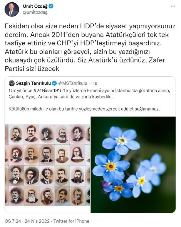 CHP'li Sezgin Tanrıkulu ittifak ortağı HDP'nin milletvekili Garo Paylan gibi skandal bir paylaşıma imza attı. Tanrıkulu yaptığı paylaşımda "107 yıl önce #24Nisan1915’te yüzlerce Ermeni aydını İstanbul’da gözaltına alınıp, Çankırı, Ayaş, Ankara’ya sürüldü ve zorla kaybedildi” dedi. Bu paylaşımın ardından Zafer Partisi Genel Başkanı Ümit Özdağ'dan çok sert tepki geldi. Özdağ, partideki Atatürkçü isimlerin tek tek tasfiye edilerek partinin HDP-PKK çizgisine kaydırıldığını ifade etti.