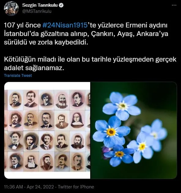 Tanrıkulu yaptığı paylaşımda "107 yıl önce #24Nisan1915'te yüzlerce Ermeni aydını İstanbul'da gözaltına alınıp, Çankırı, Ayaş, Ankara'ya sürüldü ve zorla kaybedildi" dedi.