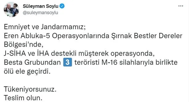 Bakan Soylu, Twitter'dan yaptığı paylaşımda, "Emniyet ve jandarmamız; Eren Abluka-5 operasyonlarında Şırnak Bestler Dereler bölgesinde, J-SİHA ve İHA destekli müşterek operasyonda, Besta Grubundan 3 teröristi M-16 silahlarıyla birlikte ölü ele geçirdi. Tükeniyorsunuz. Teslim olun." ifadelerini kullandı.