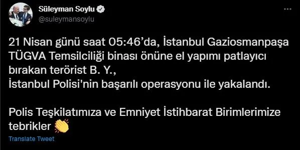 Bakan Soylu paylaşımında "21 Nisan günü saat 05:46'da, İstanbul Gaziosmanpaşa TÜGVA Temsilciliği binası önüne el yapımı patlayıcı bırakan terörist B. Y., İstanbul Polisi'nin başarılı operasyonu ile yakalandı. Polis Teşkilatımıza ve Emniyet İstihbarat Birimlerimize tebrikler" dedi.