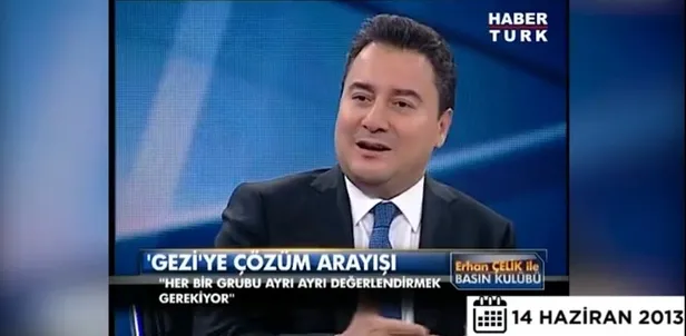 Babacan'ın 2013 yılında Habertürk kanalına verdiği röportajda ise Erdoğan'ı herkesi dinlediğini belirttiği ortaya çıktı. Babacan o dönem yaptığı açıklamada, "Sayın Başbakanımız bizzat zaman ayırarak grup grup sabahlara kadar herkesi dinledi. Sayın başbakanımızın, hükümetimizin bu gayretleri bu yaklaşımı karşılığını bulur. İllegal örgütlerin molotof kokteyleri ile demir bilyelerle ya da farklı entrümanlarla çevreye zarar vermesi, yüzlerce dükkanı yakıp yıkması, araçlara zarar vermesi, polisimize yönelik hareketler, tabi bunları oturup seyretmek gibi bir durumumuz olamazdı. Dünyanın hiçbir yerinde de zaten buna izin verilmez. Böyle bir kapıyı açtığınızda yani şiddetle istediğini elde etme bu bir yöntem haline gelir." ifadelerini kullandı.