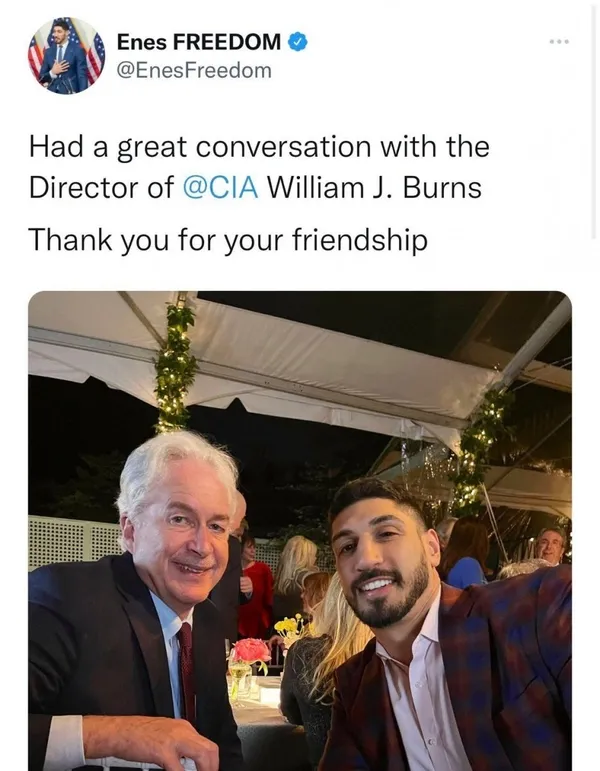 FETÖ elebaşı Fetullah Gülen’in manevi oğlu basketbolcu Enes Kanter’in CIA Direktörü William J Burns ile fotoğrafını paylaştı. Kanter, paylaşımında Burns'a dostluğu için teşekkür etmeyi de ihmal etmedi.