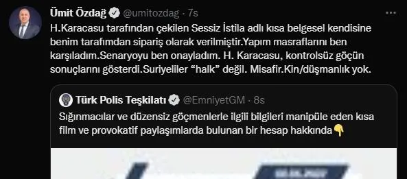 Söz konusu gelişme sonrası sosyal medya hesabından paylaşım yapan Zafer Partisi Genel Başkanı Ümit Özdağ, manipülatif filmin kendisi tarafından fonlandığını duyurdu.