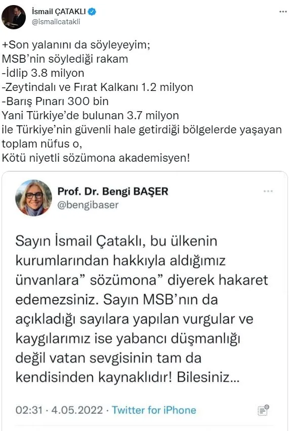 Yalanı sürdüren Başer'e İsmail Çataklı, "Bu hanımefendinin iki problemi var: Zeka ve cehalet! Okuduğunu anlamayacak kadar akıl fukarası, İnsanlığı utandıracak kadar cahil! Söylediği 8 milyon Suriyeli seçmen yalanını savunamayacak kadar cesaretsiz…Son yalanını da söyleyeyim; MSB'nin söylediği rakam -İdlip 3.8 milyon -Zeytindalı ve Fırat Kalkanı 1.2 milyon -Barış Pınarı 300 bin Yani Türkiye'de bulunan 3.7 milyon ile Türkiye'nin güvenli hale getirdiği bölgelerde yaşayan toplam nüfus o, Kötü niyetli sözümona akademisyen!" ifadeleriyle tepkisini gösyerdi.
