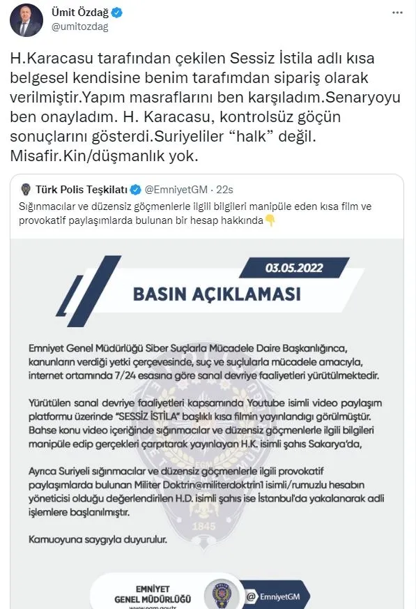 "H.Karacasu tarafından çekilen Sessiz İstila adlı kısa belgesel kendisine benim tarafımdan sipariş olarak verilmiştir. Yapım masraflarını ben karşıladım. Senaryoyu ben onayladım. H. Karacasu, kontrolsüz göçün sonuçlarını gösterdi. Suriyeliler "halk" değil. Misafir. Kin/düşmanlık yok."