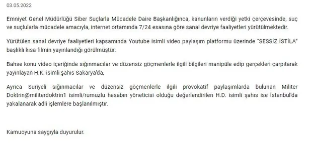 Çalışmalar kapsamında, Youtube'de "Sessiz İstila" başlıklı kısa filmin yayınlandığı belirlenerek video içeriğinde sığınmacılar ve düzensiz göçmenlerle ilgili bilgileri manipüle edip gerçekleri çarpıtarak yayınladığı tespit edilen H.K'nin Sakarya'da yakalandığı bildirildi.