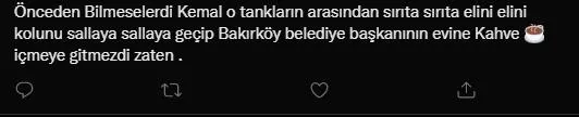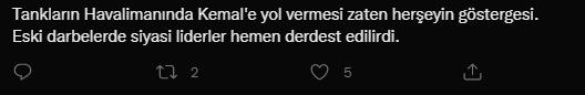 Bir başka sosyal medya kullancısı ise, "Tankların Havalimanında Kemal'e yol vermesi zaten her şeyin göstergesi. Eski darbelerde siyasi liderler hemen derdest edilirdi." dedi.