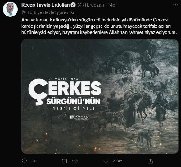 Başkan Erdoğan, sosyal medya hesabında yaptığı paylaşımda, "Ana vatanları Kafkasya'dan sürgün edilmelerinin yıl dönümünde Çerkes kardeşlerimizin yaşadığı, yüzyıllar geçse de unutulmayacak tarifsiz acıları hüzünle yad ediyor, hayatını kaybedenlere Allah'tan rahmet niyaz ediyorum." ifadesini kullandı.
