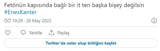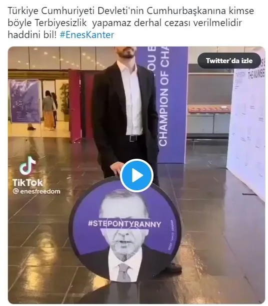 Elebaşı Fetullah Gülen'in artık çayını gönderdiği Türkiye düşmanı FETÖ'cü Enes Kanter, Başkan Erdoğan'ın posterine bastığı hadsiz bir video paylaştı. Videonun sosyal medyada paylaşılması üzerine sosyal medyadan tepki yağdı. Kullanıcılar "Ener Kanter bu hakareti Türk Milletine yapmıştır." diyerek "Türkiye Cumhuriyeti Devleti'nin Cumhurbaşkanına kimse böyle Terbiyesizlik yapamaz derhal cezası verilmelidir haddini bil!" yorumları yaptı. Öte yandan vatan haini Enes Kanter hakkında İstanbul Cumhuriyet Başsavcılığı resen soruşturma başlattı.