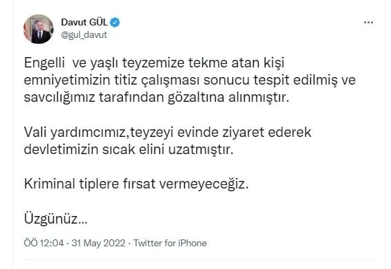 Gaziantep Valisi Davut Gül açıklama yaptı: Engelli ve yaşlı teyzemize tekme atan kişi emniyetimizin titiz çalışması sonucu tespit edilmiş ve savcılığımız tarafından gözaltına alınmıştır. Vali yardımcımız,teyzeyi evinde ziyaret ederek devletimizin sıcak elini uzatmıştır. Kriminal tiplere fırsat vermeyeceğiz. Üzgünüz…