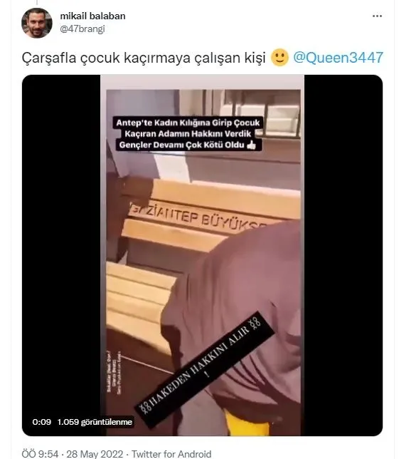 Şahinbey İlçe Emniyet Müdürlüğü'nün, 26 Mayıs 2022 tarihinde "kadın kılığına giren bir erkeğin çocuk kaçırdığı" yönünde gelen ihbarlarla ilgili olarak çalışmalarda bulunduğu öğrenildi.