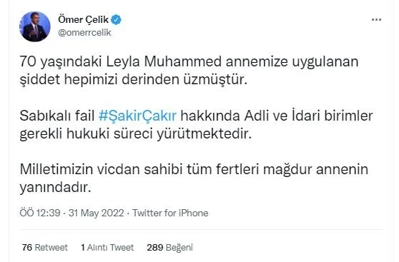 AK Partisi Ömer Çelik, "70 yaşındaki Leyla Muhammed annemize uygulanan şiddet hepimizi derinden üzmüştür. Sabıkalı fail #ŞakirÇakır hakkında Adli ve İdari birimler gerekli hukuki süreci yürütmektedir. Milletimizin vicdan sahibi tüm fertleri mağdur annenin yanındadır" dedi.