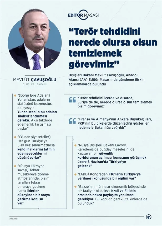 Son dakika haberi! Dışişleri Bakanı Mevlüt Çavuşoğlu, AA Editör Masası'nda Finlandiya ve İsveç'in NATO'ya başvurusuyla ilgili, "Teröre verdikleri desteği kesmelerini istiyoruz. Kanunlarında düzenleme yapılması gerektiğini kendileri söylüyor." dedi. Avrupa'nın göbeğindeki terör gösterileriyle ilgili gereken adımları attıklarını belirten Çavuşoğlu, Fransa ve Almanya'nın Ankara Büyükelçilerinin PKK'nın bu ülkelerde düzenlediği gösteriler nedeniyle Bakanlığa çağrıldığını açıkladı. Çavuşoğlu, Rusya-Ukrayna savaşı değerlendirmesinde bulunarak Rusya Dışişleri Bakanı Lavrov'un 8 Haziran'da Türkiye'ye geleceğini söyledi.
