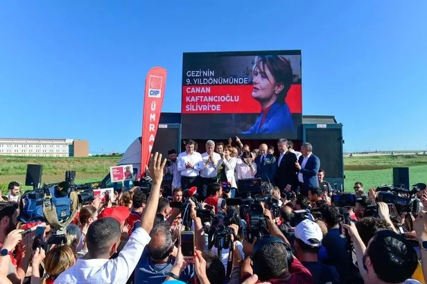 Silivri'yi şov için kullanan Canan Kaftancıoğlu'nun arkasındaki ekranda, "Gezi'nin 9. yıl dönümünde Canan Kaftancıoğlu Silivri'de" yazdığı görüldü.