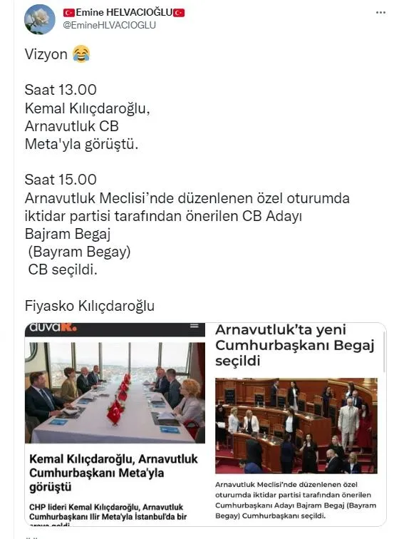 Hiçbir seçimi kazanmayıp hale seçim vaatlerine giren Kılıçdaroğlu Arnavutluk'ta da kaybeden tarafta kaldı. CHP lideri Kemal Kılıçdaroğlu öğlen saatlerinde Ilir Meta ile görüşme gerçekleştirdi, akşam yapılan seçimde Arnavutluk'un yeni Cumhurbaşkanı Bajram Begaj oldu.