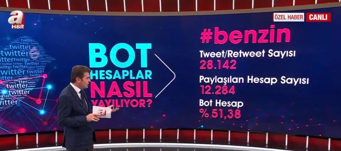 Geçtiğimiz ay 145 milyon tweet atan hesapların yüzde 23'ü bot hesap. Peki Türkiye'de en çok hangi hashtagler üzerinde bot hesaplar tespit edildi? Bot hesaplarla gündemi nasıl belirliyorlar? Sosyal medyada manipülasyon nasıl yapılıyor? En çok hangi hashtaglerde bot hesap açıldı? A Haber İstihbarat Şefi Ramazan Almaçayır detayları canlı yayında anlattı.