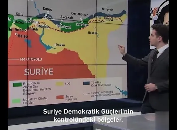 Sunucu Burak Tatari Suriye'deki son durumu aktarırken, terör örgütü YPG/PKK bölgelerini ABD'nin terör örgütünü meşrulaştırmak için kullandığı Suriye Demokratik Güçleri tanımı ile anlattı.