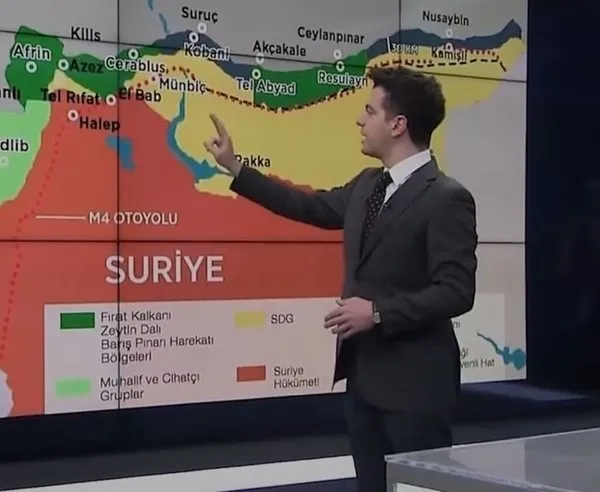 Halk TV'de Türkiye'nin olası Suriye operasyonu öncesi değerlendirmeler yapıldı. Sunucu Burak Tatari, yansıtılan harita üzerinden hangi bölgede kimlerin olduğunu anlattı. Tam bu sırada büyük bir skandal yaşandı.