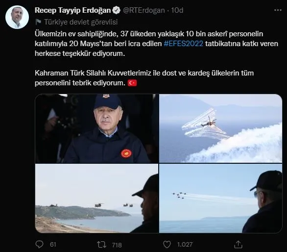Efes-2022 Tatbikatı'nın son günü vesilesiyle sizlerle birlikte olmaktan büyük memnuniyet duyuyorum. Ülkemizin ev sahipliğinde 37 ülkeden yaklaşık 10 bin askeri personelin katılımıyla 20 Mayıstan beri icra edilen bu tatbikata katkı veren herkese şahsım, milletim adına teşekkür ediyorum. Aynı şekilde tatbikat programındaki savunma sanayii sergisinde yer alan silahların, araçların ve sistemlerin de ülkemizin bu alanda ulaştığı noktayı gösterdiğine inanıyorum.