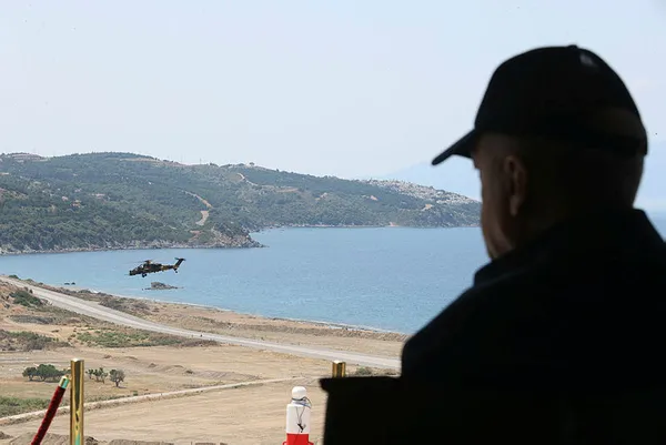 Adnan Menderes Havalimanı'nda Milli Savunma Bakanı Akar ve diğer yetkililer tarafından karşılanan Erdoğan'ın Doğanbey Atışlı Tatbikat Bölgesi'ne "uçan kale" olarak nitelendiren CH-47 Chinook helikopteri ile gelmesiyle tatbikat alanındaki göndere Cumhurbaşkanlığı forsu çekildi.