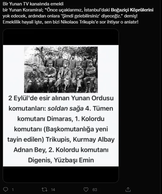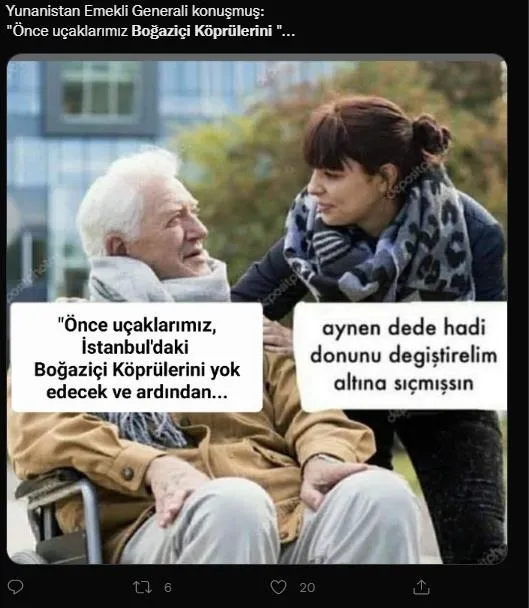 Emekli Yunan Koramiral'in sözlerine sosyal medyadan tepki yağdı. Bir vatandaş, "Bir Yunan TV kanalında emekli bir Yunan Koramiral; "Önce uçaklarımız, İstanbul'daki Boğaziçi Köprülerini yok edecek, ardından onlara 'Şimdi gelebilirsiniz' diyeceğiz." demiş! Emeklilik hayali işte, sen bizi Nikolaos Trikupis'e sor ihtiyar o anlatır!" ifadelerini kullandı.