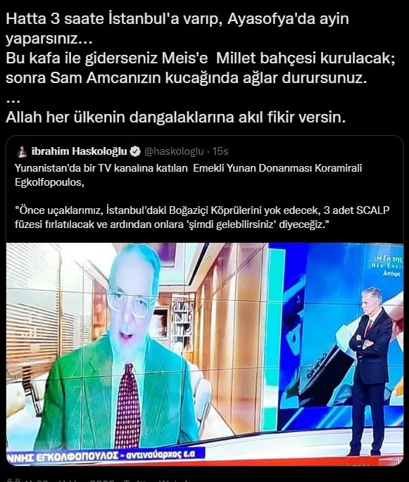 Tehditlerini daha da ileri götüren Egkolfopoulos, "Önce uçaklarımız, İstanbul'daki Boğaziçi Köprülerini yok edecek, 3 adet SCALP füzesi fırlatılacak ve ardından onlara 'şimdi gelebilirsiniz' diyeceğiz." ifadelerini kullandı.