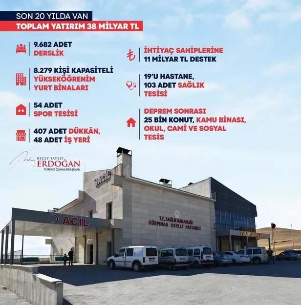 "Son 20 yılda Van'a ne kadar yatırım yaptık biliyor musunuz? 38 milyar liralık yatırım yaptık. Bunlar kamu yatırımı. Bu bütçeyle eğitimde 9 bin 682 yeni derslik inşa ettik. Gençlik ve sporda 8 bin 279 kişi kapasiteli yüksek öğrenim yurt binaları açtık. Toplam 54 spor tesisi inşa ettik. Sosyal yardımlarda Vanlı ihtiyaç sahibi vatandaşlarımıza toplam 11 milyar lira tutarında kaynakla destek olduk. Aç, açık bırakmamak için elimizden geleni yaptık. Sağlıkta 19'u hastaneden oluşan toplam 103 adet sağlık tesisi inşa ettik. Çevre ve şehircilikte 2011 yılındaki deprem sonrası 25 bin konut, kamu binası, okul, cami, sosyal tesis inşa ederek sahiplerine teslim ettik. Bunları AK Parti iktidarı olarak biz yaptık.