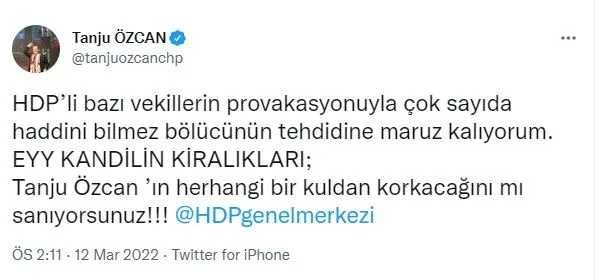 CHP'li Tanju Özcan, son olarak tehditler aldığını duyurdu. HDP Genel Merkezi resmi Twitter hesabını etiketleyen Özcan, "HDP'li bazı vekillerin provokasyonuyla çok sayıda haddini bilmez bölücünün tehdidine maruz kalıyorum. Eyy Kandilin kiralıkları; Tanju Özcan'ın herhangi bir kuldan korkacağını mı sanıyorsunuz!!!" diye yazdı.