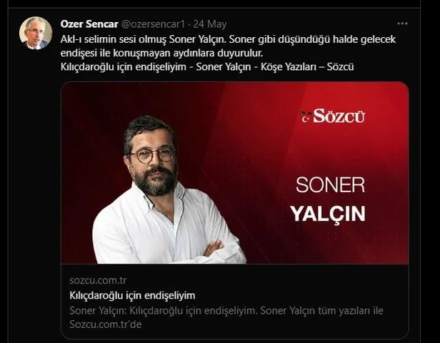 Öte yandan muhalefeti destekleyen anketleriyle bilinen Metropol'ün sahibi Özer Sencar da Yalçın'ın yazısını paylaşarak, "Akl-ı selimin sesi olmuş Soner Yalçın. Soner gibi düşündüğü halde gelecek endişesi ile konuşmayan aydınlara duyurulur." ifadelerini kullanmıştı.