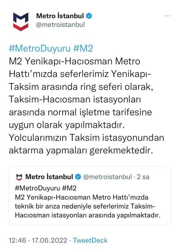 Murat Doğan isimli vatandaş ise, "Ben yeni geldim. Metro bir süredir bozukmuş. Seferler aktarmalı olacakmış. Ben de yaklaşık 10 dakikadır bekliyorum. Osmanbey'e gidecektim. Bir yere yönlendirdiklerini duymadım. Sadece burada bekliyoruz. Anons yapıldı, 15 dakika aralıklarla yapılacakmış seferler" dedi.