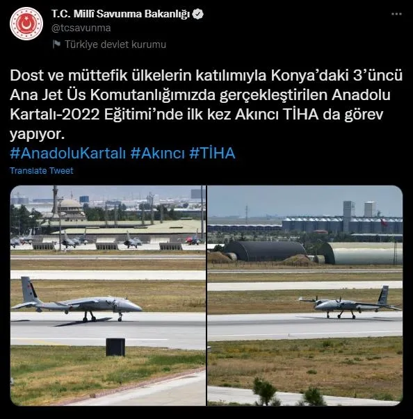 Milli Savunma Bakanlığı, (MSB) Anadolu Kartalı-2022 Eğitimi'nde, Akıncı TİHA'nın ilk kez görev yaptığını duyurdu.