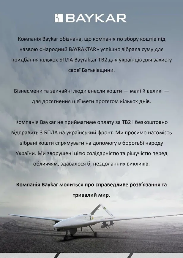 "Vatansever Ukrayna halkının belirledikleri hedefe ulaşma arzusu ve dayanışma ruhu bizi de etkiledi. Baykar olarak toplanan bağışlar ile alınması hedeflenen 3 adet Bayraktar TB2 SİHA'yı hiçbir ücret talep etmeden Ukrayna'ya hibe ediyoruz. Bu hedef için toplanan tüm bağışın ise Ukrayna'nın onurlu halkının faydasına kullanılmasını rica ediyoruz."
