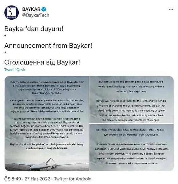 "Ukrayna halkının vatanlarını savunabilmek adına Bayraktar TB2 SİHA alabilmek için 'Halkın Bayraktar'ı' adıyla düzenlediği bağış kampanyasının çok kısa bir sürede başarıyla tamamlandığını öğrendik."