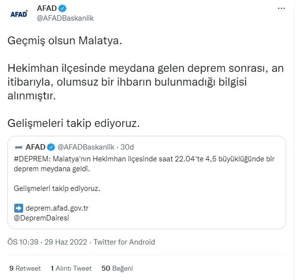 Söz konusu açıklamada, "Geçmiş olsun Malatya. Hekimhan ilçesinde meydana gelen deprem sonrası, an itibarıyla, olumsuz bir ihbarın bulunmadığı bilgisi alınmıştır. Gelişmeleri takip ediyoruz" dedi.