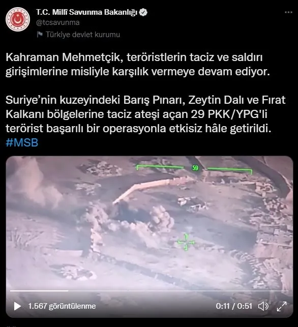 MSB'de yapılan açıklamada, "Kahraman Mehmetçik, teröristlerin taciz ve saldırı girişimlerine misliyle karşılık vermeye devam ediyor. Suriye'nin kuzeyindeki Barış Pınarı, Zeytin Dalı ve Fırat Kalkanı bölgelerine taciz ateşi açan 29 PKK/YPG'li terörist başarılı bir operasyonla etkisiz hâle getirildi." ifadelerine yer verildi.
