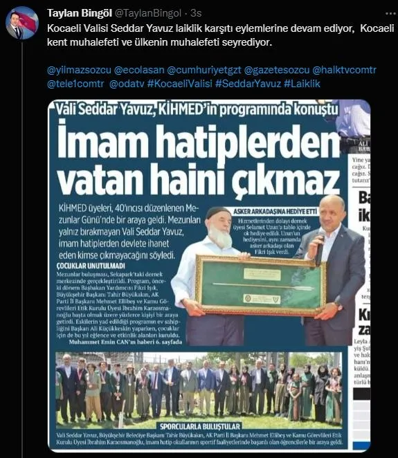 Sosyal medya hesabından bugün de Yavuz'a saldırmaya devam eden Bingöl, "Kocaeli Valisi Seddar Yavuz laiklik karşıtı eylemlerine devam ediyor, Kocaeli kent muhalefeti ve ülkenin muhalefeti seyrediyor." dedi.