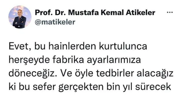 28 Şubat dönemi komutanlarından Hüseyin Kıvrıkoğlu'nun "28 Şubat bin yıl sürecek" sözüne atıfta bulunan Atikeler, "Evet bu hainlerden kurtulunca her şeyde fabrika ayarlarına döneceğiz. Ve öyle tedbirler alacağız ki bu sefer gerçekten bin yıl sürecek" dedi.