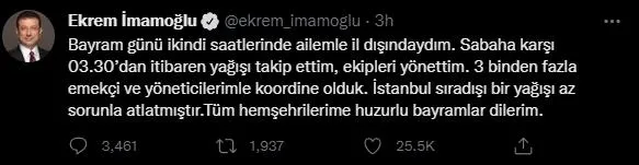 Sosyal medya hesabından bir paylaşımda bulunan İmamoğlu, İstanbul dışında olduğunu doğruladı. İmamoğlu paylaşımında, "Bayram günü ikindi saatlerinde ailemle il dışındaydım. Sabaha karşı 03.30'dan itibaren yağışı takip ettim, ekipleri yönettim. 3 binden fazla emekçi ve yöneticilerimle koordine olduk. İstanbul sıradışı bir yağışı az sorunla atlatmıştır.Tüm hemşehrilerime huzurlu bayramlar dilerim." ifadelerini kullandı.