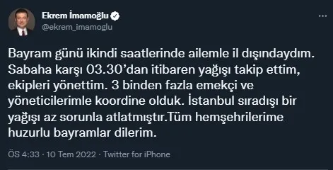 İmamoğlu paylaşımında, "Bayram günü ikindi saatlerinde ailemle il dışındaydım. Sabaha karşı 03.30'dan itibaren yağışı takip ettim, ekipleri yönettim. 3 binden fazla emekçi ve yöneticilerimle koordine olduk. İstanbul sıradışı bir yağışı az sorunla atlatmıştır.Tüm hemşehrilerime huzurlu bayramlar dilerim." ifadelerini kullandı.