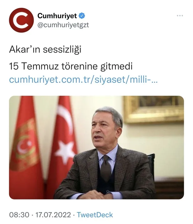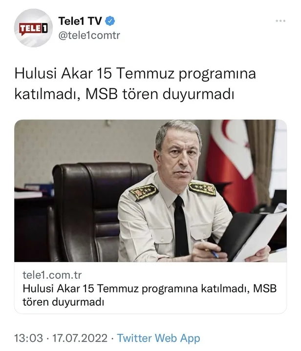 Çukur medyasının başını çeken kanallardan TELE1, "Hulusi Akar 15 Temmuz programına katılmadı, MSB tören duyurmadı" ifadelerini kullanırken CHP yandaşı Cumhuriyet ise, "Akar'ın sessizliği, 15 Temmuz törenine gitmedi" diyerek yalan ve iftira haberciliğine imza attı.