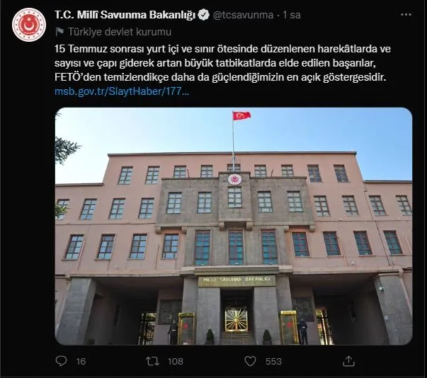"Kendine medyanın her mecrasında yer bulmak, gündeme gelmek, Bakanlığımızın FETÖ ile mücadelesi konusunda kamuoyuna yanlış bilgiler vererek manipülasyon yapmak çabasında olan bazı şahısların Bakanlığımızı, Türk Silahlı Kuvvetlerini hedef almaya devam ettiklerini görüyoruz. 15 Temmuz sonrası yurt içi ve sınır ötesinde düzenlenen harekatlarda ve sayısı ve çapı giderek artan büyük tatbikatlarda elde edilen başarılar, FETÖ'den temizlendikçe daha da güçlendiğimizin en açık göstergesidir. Bu başarıya kim gölge düşürmek isterse istesin başaramayacak, asil milletimizin bağrından çıkan kahraman Mehmetçiğin moral ve motivasyonunu bozamayacaktır. Yalan yanlış bilgilerle sorumsuzca yapılan söylem ve eylemlerin kimlerin işine yaradığı, kimlerin neleri perdelemek istediğinin dikkate alınması, iyi değerlendirilmesi ve göz ardı edilmemesi gereken bir durum ve gerçekliktir. Bakanlığımız bünyesinde FETÖ ile iltisaklı tek bir personel kalmayıncaya kadar mücadelemiz devam edecektir. Türk Silahlı Kuvvetlerimizin şanlı üniformasını hiçbir hainin taşımasına asla müsaade edilmeyecektir. FETÖ ile mücadele hukuk çerçevesinde tüm birimlerde aynı anlayış, disiplin ve kriterlerle yürütülmekte, devletimizin istihbarat kurumlarından, birimlerimizden ve diğer kaynaklardan elde edilen istihbarat ve bilgilere mutlaka gerekli işlem yapılmaktadır. Nitekim bugüne kadar 24 bin 395 personel ihraç edilmiş, 2 bin 567 personelin rütbeleri geri alınmıştır. Son bir yılda ise bin 980 personel ihraç edilmiş, 561 personelin de rütbesi geri alınmıştır. Yani başta FETÖ olmak üzere terör örgütleri ile artan şiddet ve tempoda mücadelemiz devam etmektedir, edecektir. Bu vesileyle 15 Temmuz'da ordu-millet gerçeğini bir kez daha sergileyerek canlarını feda eden tüm şehitlerimizi, ebediyete intikal eden kahraman gazilerimizi bir kez daha rahmetle ve minnetle yad ediyor, hayatta olan gazilerimize, şehit ve gazilerimizin kıymetli ailelerine, sevgisi, güveni ve duasından güç aldığımız asil milletimize saygı ve şükranlarımızı sunuyoruz."