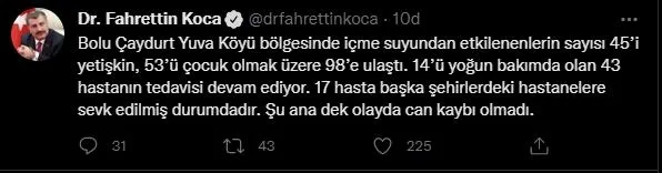 Bakan Fahrettin Koca, Twitter hesabından yaptığı açıklamada, "Bolu Çaydurt Yuva köyü bölgesinde içme suyundan etkilenenlerin sayısı 45'i yetişkin, 53'ü çocuk olmak üzere 98'e ulaştı. 14'ü yoğun bakımda olan 43 hastanın tedavisi devam ediyor. 17 hasta başka şehirlerdeki hastanelere sevk edilmiş durumdadır. Şu ana dek olayda can kaybı olmadı" dedi.
