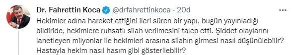 FETÖ ile iltisaklı olduğu bilinen HEKİMSEN'in resmi açıklama ile 'silah' talebinde bulunmasının ardından Sağlık Bakanı Fahrettin Koca duruma tepki gösterdi.