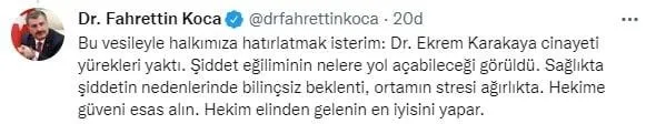 Koca, "Bu vesileyle halkımıza hatırlatmak isterim: Dr. Ekrem Karakaya cinayeti yürekleri yaktı. Şiddet eğiliminin nelere yol açabileceği görüldü. Sağlıkta şiddetin nedenlerinde bilinçsiz beklenti, ortamın stresi ağırlıkta. Hekime güveni esas alın. Hekim elinden gelenin en iyisini yapar." İfadelerine yer verdi.