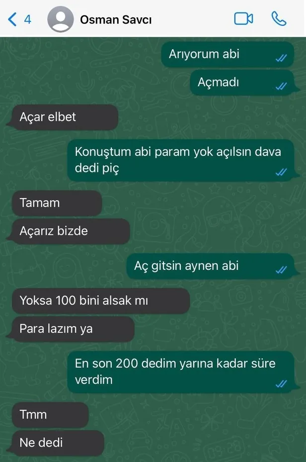Örgütün FETÖ/PDY'ye üye olma suçlaması ile soruşturma başlatılan ve kovuşturma yapılmasına yer olmadığı yönünde karar verilecek olan şüphelilerden "takipsizlik kararı" karşılığında para istemesi WhatsApp konuşmalarına yansıdı. Sabah'ta yer alan habere görei ulaşılan WhatsApp konuşmalarında, örgüt üyesinin savcı Osman Yarbaş'ın talimatıyla bir doktordan 400 bin lira para istediği, doktorun parayı çok bulması sonucu savcının örgüt üyesine "Para lazım 100 bini alsak mı?" dediği yer aldı.