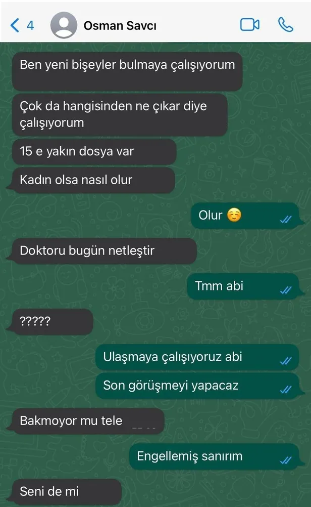 Ele geçirilen WhatsApp konuşmalarında, örgüt üyesinin savcının talimatıyla bir doktordan "takipsizlik kararı" karşılığında para istediği yer alırken, örgüt üyesi ile savcı arasında geçen diyalog şöyle: