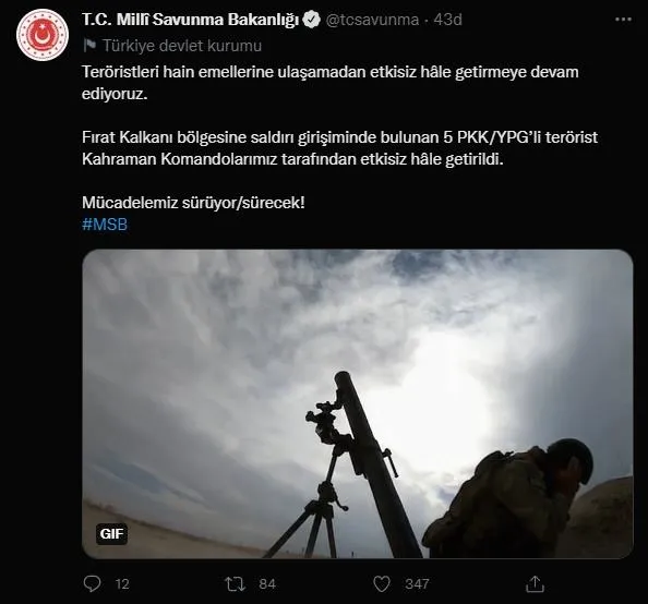Bakanlığın Twitter hesabından yapılan açıklamada "Teröristleri hain emellerine ulaşamadan etkisiz hale getirmeye devam ediyoruz. Fırat Kalkanı bölgesine saldırı girişiminde bulunan 5 PKK/YPG'li terörist kahraman komandolarımız tarafından etkisiz hale getirildi. Mücadelemiz sürüyor, sürecek" denildi.
